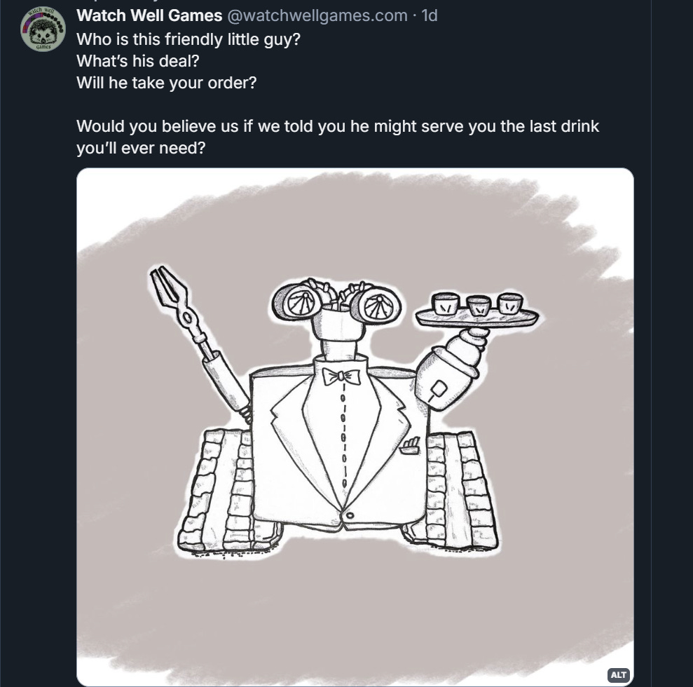 We just started to tease the Watch Well Games creators coalition zine. You’ll find nuggets, like this cute lil’ robot drawn by yours truly, over on our Bluesky: