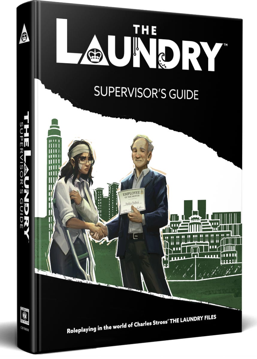 K.J.: Switching gears, what led to the decision to go from using d100 in The Laundry RPG 1e to a pool of d6s in the second edition of the game? (I’m a fan of both dice mechanics, so I’m very interested in knowing!)