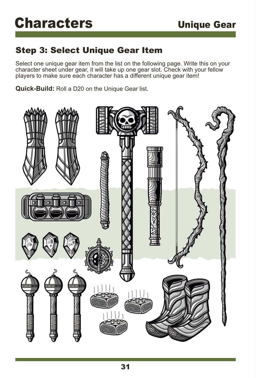 So with the rules out of the way we come to creating your hero in five simple steps. Choose a lineage from the usual Dwarves, Elves, and Humans to the unusual in the form of Frooms (fun-guys), Ruckwors (rock-hard), and Wildern (cute anthropomorphic woodland creatures). Next add up to +4 between three strong aspects and -2 for the remaining weak ones. Select one unique piece of gear, your basic gear in the form of weapons, armor and all the other stuff, choose a name and you’re ready to play. And that’s the players section done.