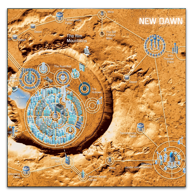 Once constructed robot cities are self-contained and surrounded by hostile environments so Robots rarely have the need (or desire) to go outside. Their society is decentralised with most existing in self-contained ecosystems. One such city, New Dawn is extensively detailed, representing a pristine example of what robots can achieve through hard work and diligence. There’s a fabulous two-page full color map of the city showing key locations which makes for a useful homebase from which to start a campaign. Several areas are extensively detailed with information on important places located within, NPCs to interact with, and narrative hooks to help form fully-fledged adventures.