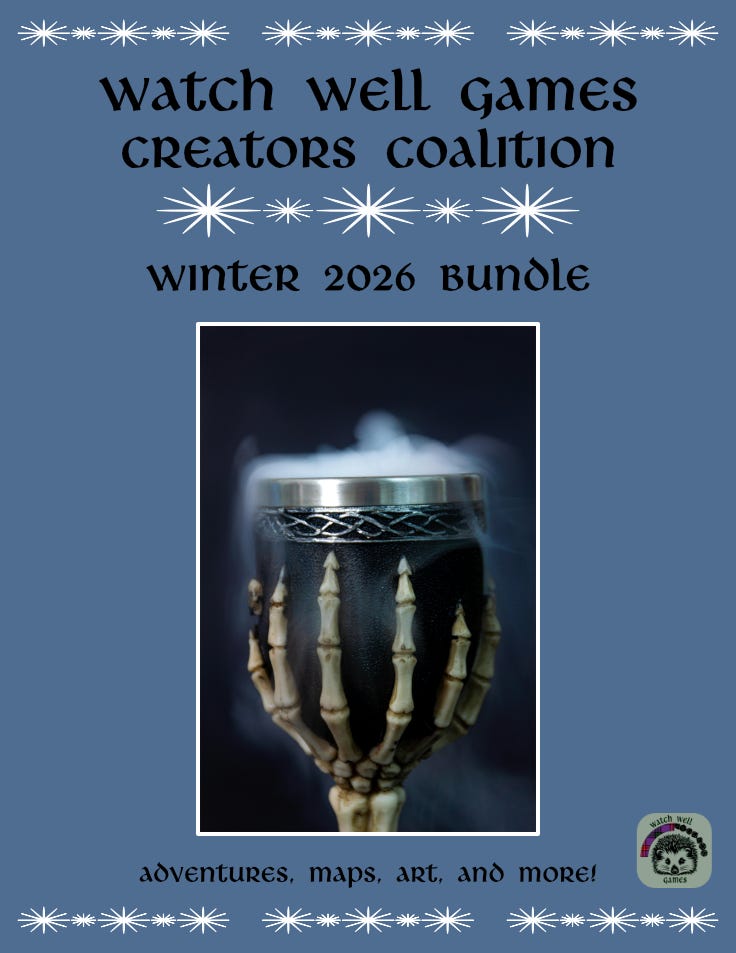 What was meant to be a celebration … turned out to be a disappointment. DTRPG had a bug in its system, causing our first-ever zine (released late Nov. 2025) to be incorrectly labelled as AI (rest assured, it’s 100% human-made). As a result, most folks didn’t even see the listing. All is well now, but our team worked incredibly hard on this. It’s on sale at 30% off, and I’ve included a very special discount here for YOU so it’s at 35% off! (Both offers expire February 16th.)